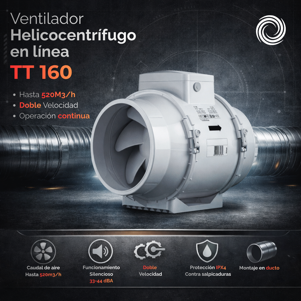 El Airolite TT 160 es el ventilador helicocentrífugo en línea más potente de su serie, diseñado para ofrecer una ventilación de alto caudal en ambientes que requieren una extracción robusta y constante. Gracias a su diseño mixto axial-centrífugo, este modelo es ideal para aplicaciones en baños amplios, cocinas industriales, locales comerciales, bodegas, invernaderos y otros espacios con alta demanda de ventilación.